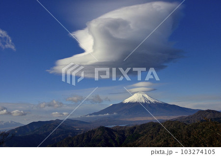 丹沢山地の菰釣山山頂より吊るし雲と笠雲が浮かぶ富士山