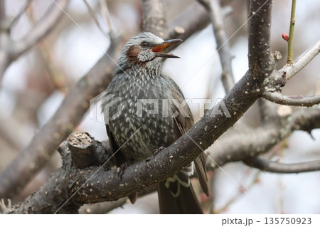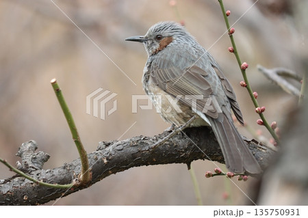 開花まじかの梅林で春を待つヒヨドリ