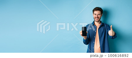 Handsome young man showing thumbs up gesture and empty smartphone screen, recommending app or company, standing on blue background