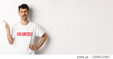 Disappointed volunteer showing bad promo offer, sticking tongue and grimacing disgusted, pointing finger left, wearing organization t-shirt, white background