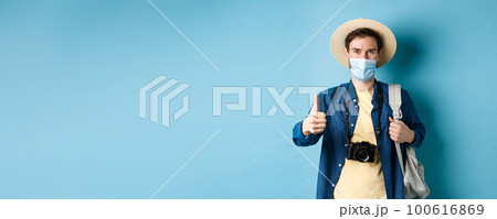 Covid-19 and summer holidays concept. Smiling guy travelling in medical mask and straw hat, backpacking and showing thumbs up, approve and praise travel agency, blue background