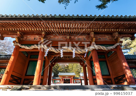 奥日光、二荒山神社中宮祠の楼門と鳥居 日光、栃木県、日本。2月