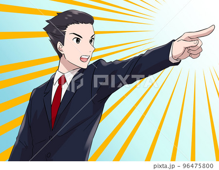 勢いよく指差ししているスーツ姿の若い男性 集中線背景有り