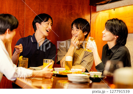 居酒屋で乾杯する若い男子