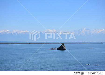 雨晴海岸から男岩と防波堤と煙突と立山連峰の景観 2019.04