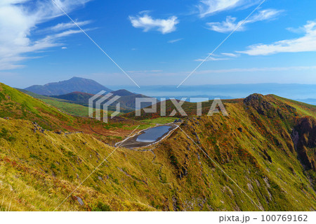 活火山 秋田駒ケ岳 男女岳山頂から阿弥陀池 男岳と女岳を見下ろす