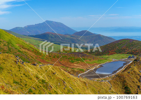 男岳山頂から眺めた紅葉の秋田駒ケ岳と田沢湖