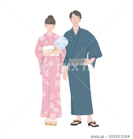 浴衣を着たカップルの全身イラスト