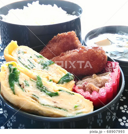 白いご飯と味噌汁とおかずの盛られた手作り弁当
