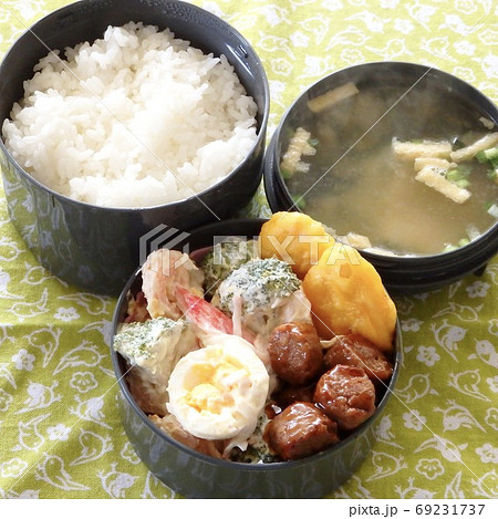 玉ねぎとじゃがいもの味噌汁付き有り合わせの手作り弁当
