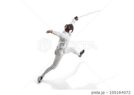 Dynamic portrait of male athlete in fencing costume with sword in hand in action isolated on white studio background.
