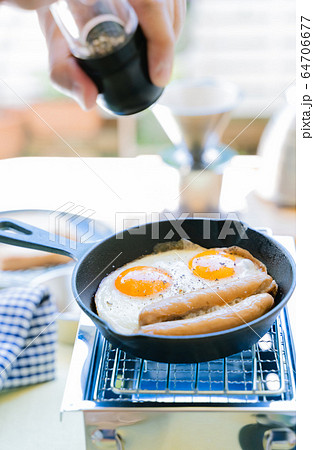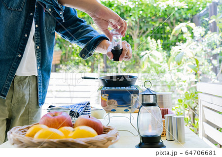 男性 庭キャンプ 朝食