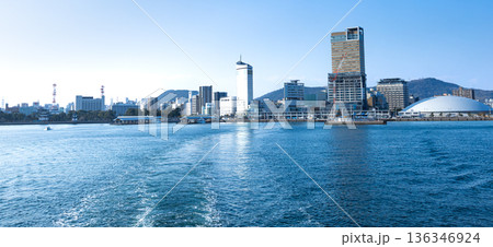 男木島行きのフェリーから見た高松港の高層ビルが立つ都会的風景