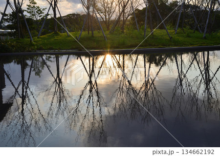 岩手県紫波町野村胡堂あらえびす記念館前に広がる田んぼに水を張った田園風景