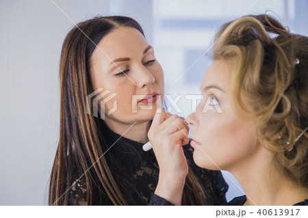 Creative fashion beauty portrait of a beautiful young blonde woman with an artistic tassel in her hands.