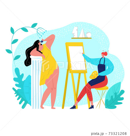 Painting Flat Illustration with Someone who Paints using Easel, Canvas, Brushes and Watercolor for Poster or Workshops Designs