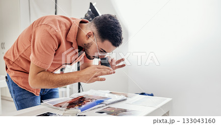 Photography, editing and man photographer in a studio working on fashion or creative images. Art, creativity and male analyzing pictures from a photoshoot at a digital, design or production agency.