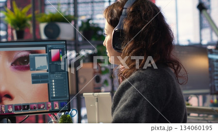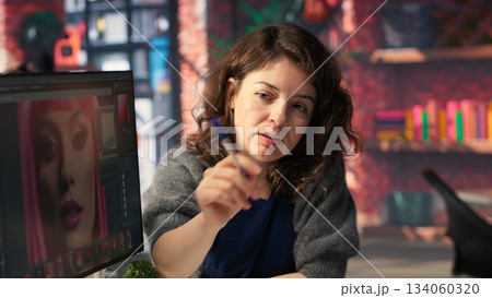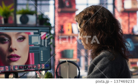 Woman editor using color grading on retouching software at the agency, working on professional high quality photos. Designer working with editing interface and tools for media content. Camera B.