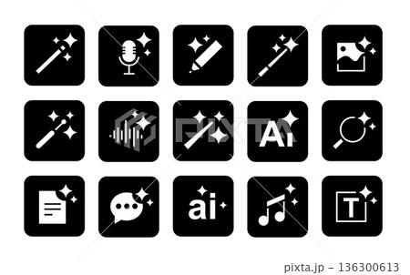 AI and magic icons. Wands and sparkle stars for chatbot. Voice enhancement, text document edit, retouch and image generation, audio effect, AI search, chat generate, music create tools vector set