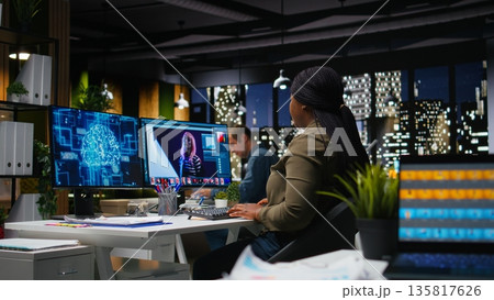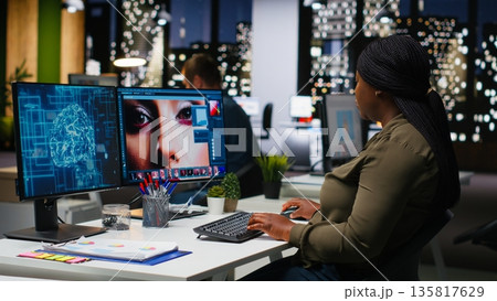African american woman photographer uses neural networks system to edit photos, creating professional content with artificial intelligence. AI powered software for retouching on pc. Camera B.