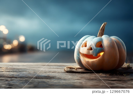 A carved Halloween pumpkin lantern sits illuminated on an old wooden table, its glowing face shining against a dark, blurred background with warm lights.