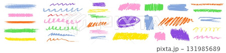 Bright colorful childish scribbles set. Colored crayon doodle line and stripe collection. Hand drawn rough charcoal brushstroke element pack. Pastel pencil curly, wavy, squiggly strokes bundle. Vector