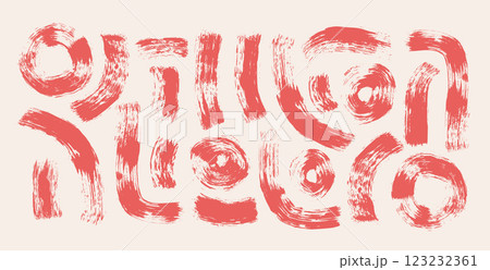 Brush stroke squiggle and circles ink lines. Vector hand drawn wave round paint shapes composition. Abstract red curve freehand graphic elements. Scribble paintbrush wobble wavy grunge illustration