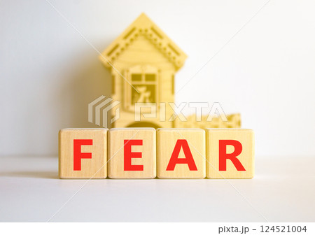 Fear symbol. Concept word Fear on beautiful wooden blocks. Beautiful white table white background. Wooden beautiful house. Business, lifestyle and fear concept. Copy space.