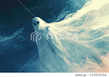 Ethereal Ghostly Figure in Abstract Blue and White Vapor Background Spooky, Mysterious, Haunting