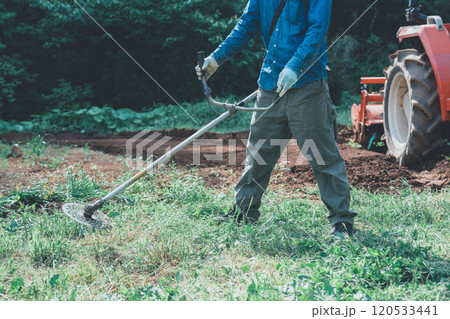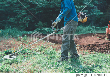 畑の雑草を刈払機で刈る男性