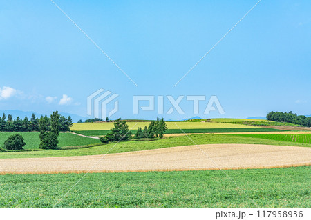 緑色の畑と青空のコントラストが美しい夏の北海道(イメージ)