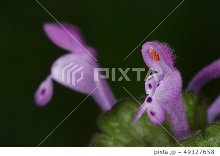 自然 植物 ホトケノザ、花です。細長い筒を持つ唇形状、オレンジ色は雄しべの葯です