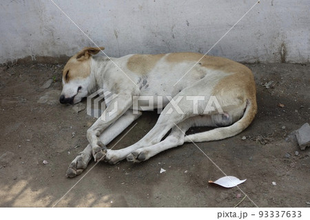 デリーの路上で右向きに寝ている一匹の犬の画像
