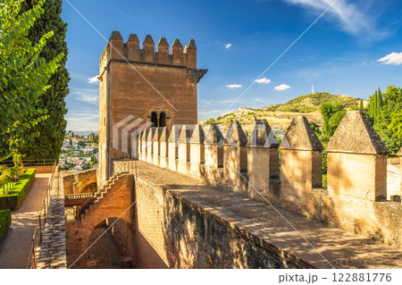 Alhambra complex in Granada town, Andalusia, Spain. Ancient fortress walls and tower overlooking a cityscape under a vibrant blue sky.