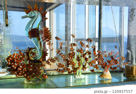 鹿児島県タツノオトシゴハウスの竜の落とし子と置物と開聞岳