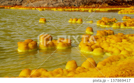 エチオピア・ダロールの酸性湖に現れる硫黄形成物