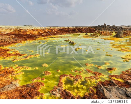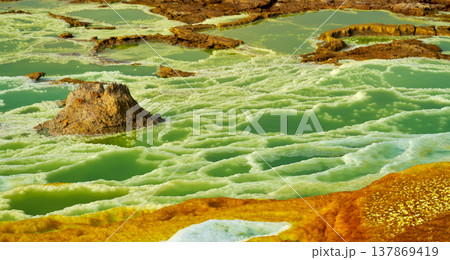 エチオピア・ダロールの酸性硫黄湖と鉱物地形
