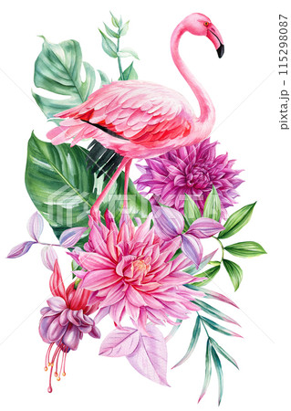 Cute Flamingo watercolor bird illustration, pink flamingo and tropical flowers, palm leaves isolated on white background