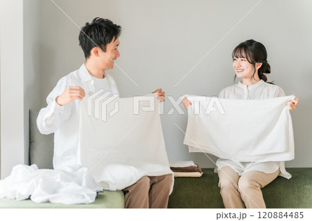 洗濯物を一緒に畳む若い夫婦(柔軟剤・タオル・部屋干し)