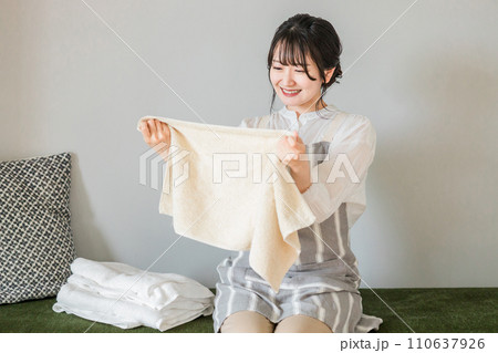 バスタオルを畳む女性(主婦・家事代行・ホームヘルパー)