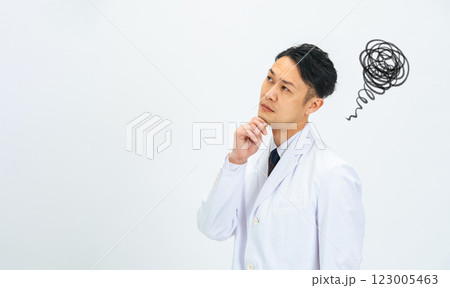 悩む白衣を着たミドルエイジ男性医師・研究者