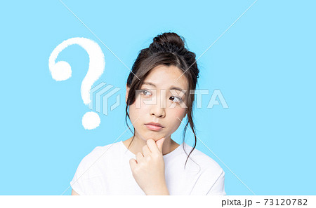 クエスチョンマークのある場面:疑問を感じて頭の中にクエスチョンマークが生まれている若い女性