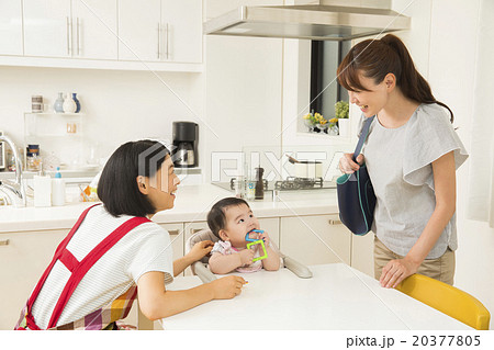 赤ちゃんと仕事に行くお母さんとベビーシッター