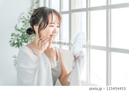 鏡で歯を見て困るアジア人女性(虫歯・歯並び・歯周病)