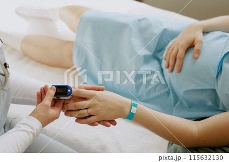 Nurse holding pregnant patients hand and examining her saturation with help of pulse oximeter