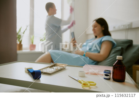 Pregnant patient having conversation with nurse while she making ready IV therapy