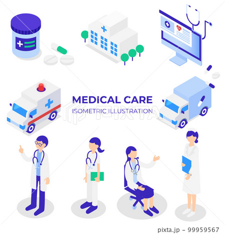 医療系のアイソメトリックイラストセット(医療従事者や救急車など)