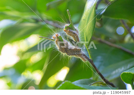 葉っぱの裏に並んでいるチャドクガの幼虫