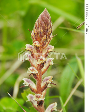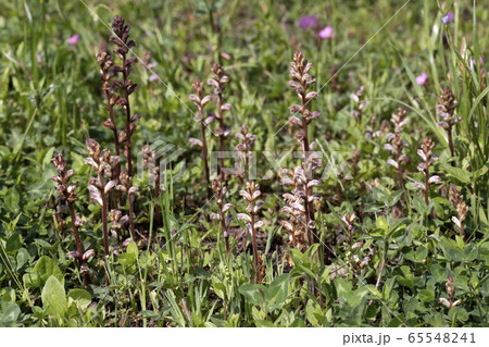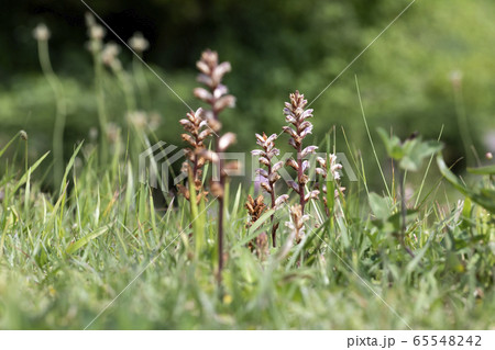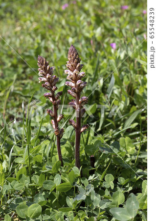 自然 植物 ヤセウツボ、葉緑素を持たない寄生植物で外来種です。様々な植物に被害を与えるようです
