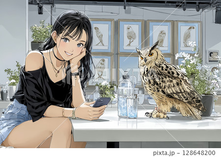 フクロウカフェ 梟と一緒に自撮りする女性のイラスト素材 スマホ